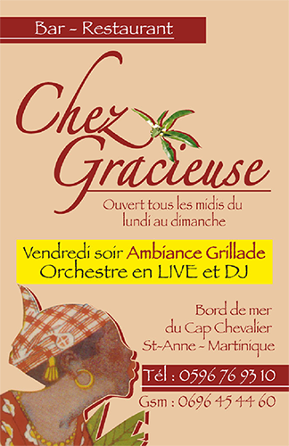 Au restaurant Chez Gracieuse, vous dégusterez les spécialités créoles délicieuses, après une longue journée d’excursion en mer à Sainte-Anne en Martinique à bord du Taxi Cap. Ce restaurant en Martinique, fidèle aux traditions antillaises est connu dans la région pour la haute qualité de sa gastronomie et de ses prestations.